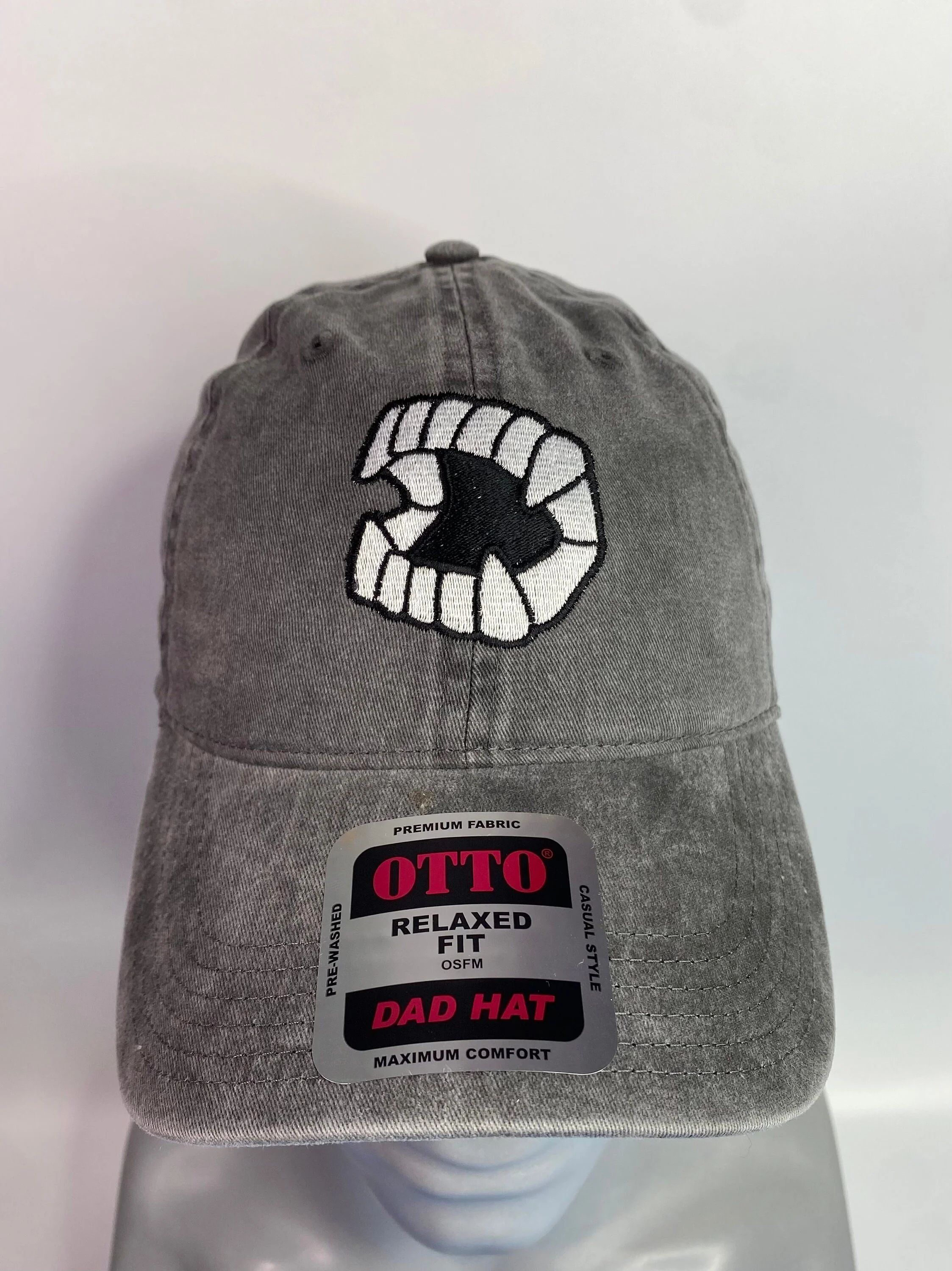 Halloween Vampire Teeth low profile Embroidered hat that's 100% cotton. It's a washed pigment dyed cotton twill ball cap. One size fits most. The pigment dye gives the hat a worn in comfortable feeling. It has that old hat look to it. Choose your color- navy garment washed, charcoal gray garment washed, red garment washed, khaki garment washed, or royal blue garment washed in the drop down menu.